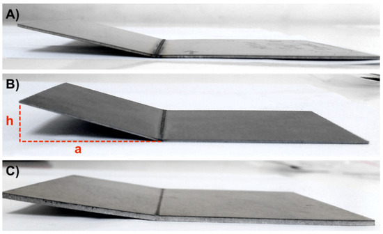 Resulting sheets after the LBF treatment for bending: (A) AISI 304 stainless steel, (B) interstitial free (IF) steel, and (C) AA 6013 aluminum alloy samples subjected to LBF. The parameters a and h were used to calculate the bending angle for the different cases.