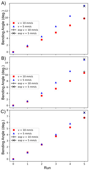 The simulated bending angle at the end of each laser run and the experimental angle at the end of the LBF process, after five runs, are shown in Figure 2. The experimental final bending angle agrees with the numerical simulation for the three analyzed materials. Moreover, the results of the models for the three materials show that the number of laser beam runs promotes larger bending angles, with a roughly linear relationship between the bending angle and number of irradiations for the scanning velocity of 10 mm/s and higher rates after each run for the scanning velocity of 5 mm/s.