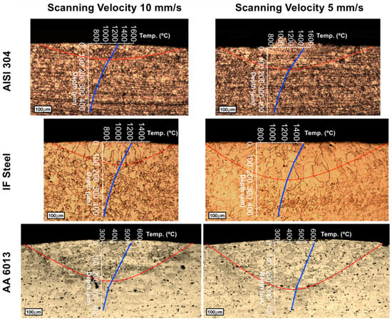 The temperatures simulated in the affected zone for the scanning velocity of 5 mm/s are close to the solidus–liquidus temperatures, and therefore the natural question arises: why there is no strong evidence of melting in the metallography images (see Figure 3)? To answer this question, a balance of energy must be analyzed. The model takes into account the absorption of energy to increase the temperature (specific heat) and to the phase transition (latent heat), but not the energy that is absorbed for grain growth processes. As shown in the metallography images, grain growth is evident for all the samples and for all scanning speeds of the LBF treatment. Indeed, the activation energy for the grain boundary diffusion is about 84 kJ/mol for Al, whereas it is 174 kJ/mol for Fe [29], which explains the higher observed front point depth, i.e., the higher amount of grain that grows, in aluminum over steels (see Figure 2). In this regard, further studies will be devoted to the incorporation of grain border diffusion into the current model and to better quantify the grain growth process through electron backscattered diffraction (EBSD), as performed by Suarez et al. [28].