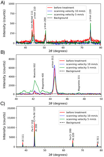 In order to deeply analyze the behavior of the matrix phases after the laser treatment, Figure 5 shows magnified views of the XRD diffractograms of the selected phases, showing the peak shifts in the different samples subjected to LBF. It is worth noting that for all samples and scanning velocities, both the peak intensity and angle position changed. The former can be attributed to grain growth and the latter to the presence of residual stresses [27,28]. In this regard, the peaks shown in Figure 5 were adjusted with Gaussian profiles in order to quantify the peak shifts, and thereafter the stress development relative to the non-treated sample. Due to their isolation (non-convolution), the following reflection peaks were chosen for stress analysis: 110 of γ-iron for AISI 304, 001 of α-iron for IF steel, and 311 of Al for AA 6013.