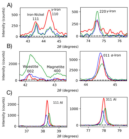 Magnified views of the XRD diffractograms of the selected phases showing the shifts in the different reflection peaks for (A) AISI 304 steel, (B) IF steel, and (C) AA6013 aluminum samples subjected to LBF. Red line: before treatment; blue line: scanning velocity of 10 mm/s; green line: scanning velocity of 5 mm/s; dashed line: background.