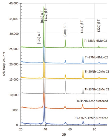 Chemical characterization was completed by conducting corrosion tests and considering that these alloys were designed as β-Ti alloys. These alloys exhibited better corrosion behavior than the rest [].