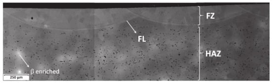 Microstructure of the Ti-13Nb-12Mo alloy treated by laser fusion under condition C1. In detail, the fusion line (FL), heat-affected zone (HAZ), and fusion zone (FZ) regions are observed.