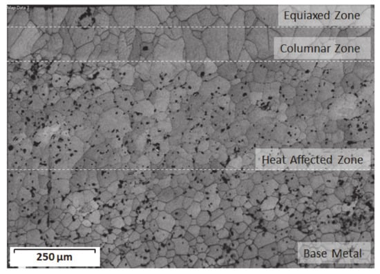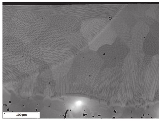 The image in Figure 15, which is related to the cross-section of the Ti-27Nb-8Mo alloy (Condition 2) with laser surface fusion, allows us to clearly see the three zones into which we divided the specimen: FZ, HAZ, and BM. In this image, the different microstructural zones are roughly marked because of the wide variety in the laser-fused zone between grain characteristics. Although columnar grain growth is seen, we also found that grains were more equiaxed in the most superficial area. In this way, the laser fused zone can be divided into two zones: An equiaxial microstructure zone exposed to a very fast cooling rate for being that which came into contact with air; a columnar microstructure with grains of 100–250 μm in diameter and subjected to a somewhat slower cooling rate. So, these columnar grains nucleated from HAZ and grew vertically through FZ.