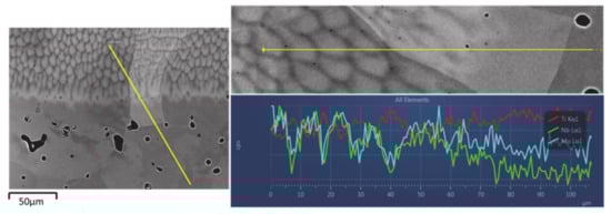The Energy-dispersive X-ray spectroscopy (EDS) line analysis carried out on this same alloy, in its C1, showed clear variations in its composition with dendrites structures rich in Mo and Nb, but dendritic spaces rich in Ti (Figure 4). However, the distribution of the elements in HAZ was much more homogeneous with complete particle fusion, mainly of Nb, in the BM (see Figure 4).
