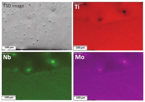 Nb and Mo unmelting was clearly seen in some areas in the BM, such as the region studied in Figure 5, with the compositional distribution maps of each element obtained by dispersive energies. Ti was considerably lacking in the particles in which Nb was highlighted for its increased concentration.
