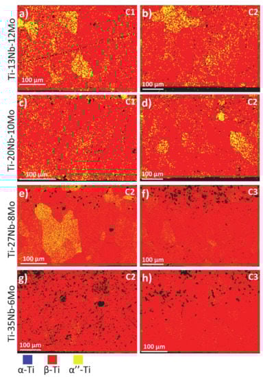 Phases obtained for the samples with surface Ti-Nb-Mo fusion: (a,b) Ti-13Nb-12Mo alloys treated under conditions C1 and C2; (c,d) Ti-20Nb-10Mo alloys treated under conditions C1 and C2; (e,f) Ti-27Nb-8Mo alloys treated under conditions C2 and C3; (g,h) Ti-35Nb-6Mo alloys treated under conditions C2 and C3. The blue phase is hexagonal Ti, the red phase corresponds to cubic Ti and the yellow phase to the orthorhombic Ti of the martensitic phase.