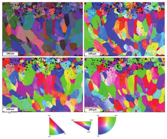 The analysis of Euler maps and inverse pole figures (IPF) allowed grain distribution to be observed in both FZ and HAZ (Figure 7). These images can explain the differences between the grain size considering practically only the β-phase grains given the limitations indicated and the minimum grain size in pixels and disorientation on the grain edge to contemplate different grains.