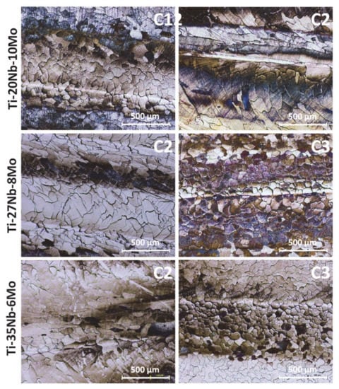 Alloys’ porosity seemed to rise with higher Nb and lower Mo contents. However, the values of the contractions that samples underwent did not significantly differ among distinct compositions. Interestingly, the open porosity after SML in the Ti-13Nb-12Mo and Ti-20Nb-10Mo alloys presented a proportional reduction in porosity with increasing laser beam power. However, the reduced porosity in the Ti-27Nb-8Mo and Ti-35Nb-6Mo samples increased with rising energy laser beam density. Slowing laser speed can increase the area of the beads obtained due to the longer interaction time between the laser and the surface. Laser fusion can cause surface cracks or defects, and thermal exposure leaves HAZ below the cast surface, which modifies its mechanical properties. Typically, this area that occupies around 400–600 µm under the FZ layer can be reduced using lasers run at higher speeds [].