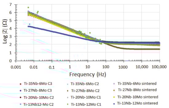 Bode diagrams of the all Ti-Nb-Mo samples.