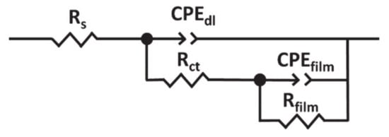 The electrical circuit that simulates a parallel equivalent circuit to represent a porous oxide layer, where Rs is the resistance of the solution, CPEdl and Rct are the constant phase element and the resistance to charge transfer, and CPEfilm and Rfilm are the constant phase element and the resistance of the passive layer.