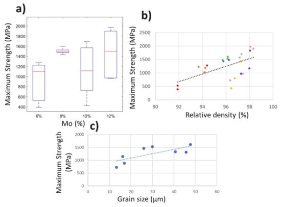 Representations of the maximum resistance obtained in the three-point bending tests: (a) Boxplots shown in accordance with the alloy’s Mo content (b,c) two scatter plots according to relative density and grain size.