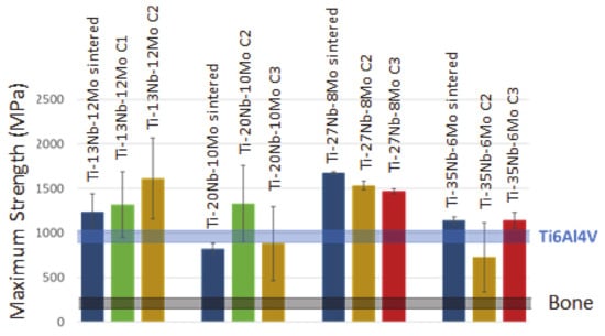 The obtained flexural strength values are considered relatively high as they are well above the flexural strength of bone tissue, whose range is around 110–184 MPa []. To make a comparison of the flexural strength values of other medical materials, such as forging Ti-6Al-4V, Figure 13 shows the 896–1103 range [], despite the fact that the obtained values are not higher for all the alloys and quite a small difference.