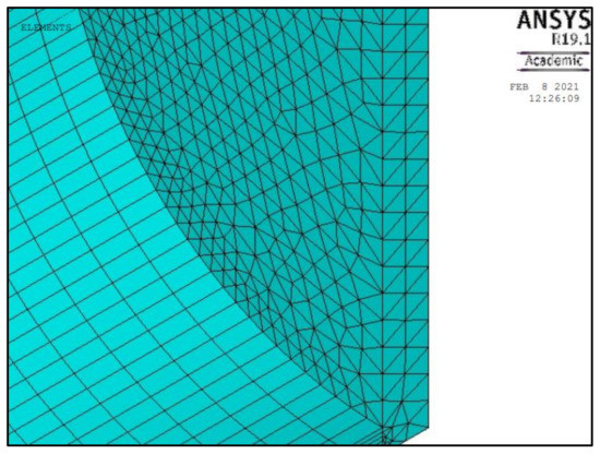ANSYS 16.1 (Ansys Inc., Canonsburg, PA, USA) Structural Product of Mechanical ANSYS Parametric Design Language (APDL) or ANSYS for short, was used for the meshing and FEA of the corroded pipe models. ANSYS offers a wide range of element types for meshing depending on the material geometry and properties. In this study, due to the thickness of the pressurized pipe walls, solid elements were used instead of shell elements to increase the accuracy of the element meshing [26]. The pipe body and defect region were meshed using hexahedral SOLID185 elements while the endplates were meshed using tetrahedral SOLID186 elements. SOLID185 is defined by 8 nodes having three degrees of freedom while SOLID186 can tolerate irregular shapes such as curved boundaries. Both these elements accommodate high-stress stiffening, creep, large deflection, plasticity, swelling, and large strain [27]. The application of SOLID185 and SOLID186 elements on a pipe model is illustrated in Figure 3 and Figure 4 respectively.