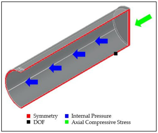 Application of symmetrical boundary conditions, internal pressure, compressive stress, and degree of freedom (DOF) constraint for quarter pipe models.