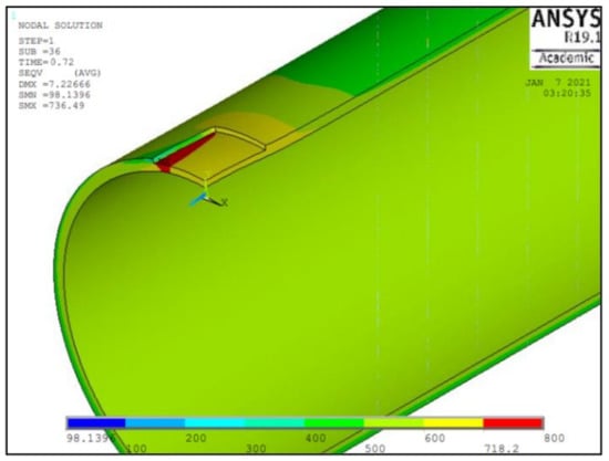 In this study, a stress-based criterion was utilised to determine the point of pipe failure. When the equivalent stress exceeds the true ultimate tensile stress of the material, plastic collapse occurs. During FEA, the failure pressure of a pipe was determined by observing the von Mises stress distribution across the pipe, where the region of defect is the most critical part of the pipe. When the von Mises stress reaches the true ultimate tensile strength of the material, the material is said to have failed, as illustrated in Figure 6 [29].
