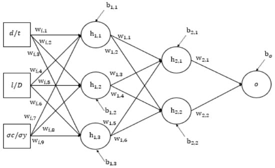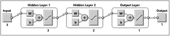In this study, MathWorks MATLAB R2019b was utilised to develop a feed-forward neural network. This architecture was utilised as it models the relationship between the input and output based on a set of training data. The ANN was designed to receive three input values and output one value. The input values were the normalised defect depth, defect length and axial compressive stress, while the output value was the normalised pipe failure pressure. The ANN was developed with two hidden layers, where the first and second layer consisted of three and two neurons respectively, as illustrated in Figure 8, which was extracted from MathWorks MATLAB R2019b. The number of hidden layers and neurons in each hidden layer was determined based on regression analysis of the ANN model.