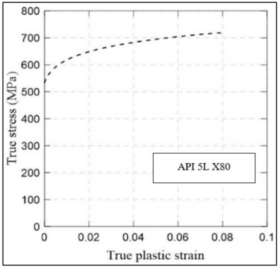 A high toughness pipe grade of API 5L X80 was utilised in this study. The material properties of the pipe body were represented by a nonlinear true stress-strain curve of the material, as illustrated in Figure 9.