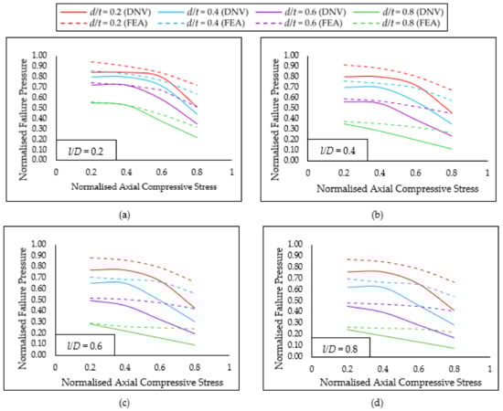(a) Normalized failure pressure predictions of API 5L X80 pipe using FEA and DNV subjected to internal pressure and axial compressive stress for a normalised defect length of (a) 0.2; (b) 0.4; (c) 0.6; and (d) 0.8.