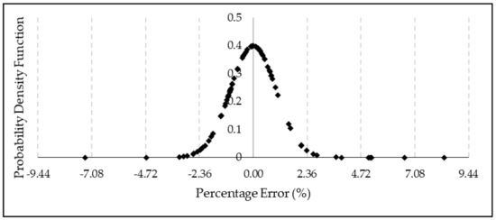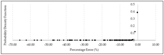 Of the failure pressures, 58.4% have a percentage difference of greater than 10% when compared to the failure pressures obtained using FEM, as illustrated in the probability distribution function in Figure 12. The percentage difference between the results obtained using FEA and DNV was calculated using Equation (7).