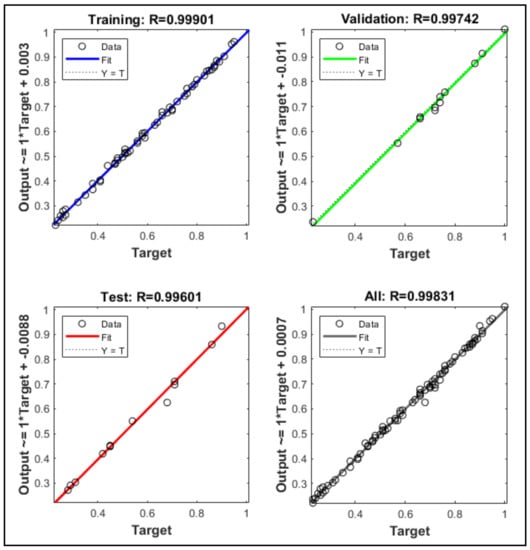 The ability of the ANN to produce outcomes close to the training data was measured using the coefficient of determination (R2) of the model. The R2 value ranged from 0.0 to 1.0, with a greater R2 value indicating a better goodness of fit, which is the distance between the fitted line of the ANN’s regression plot and the training data points.