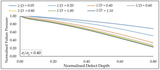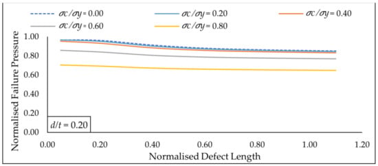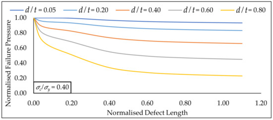 Based on Figure 18, at a constant normalised axial compressive stress of 0.40, the influence of normalised defect length on the decrease in normalised failure pressure can be observed in more detail as the normalised defect depths are increased from 0.05 to 0.80. Since the decrease in normalised failure pressure was only 6.12% for a normalised defect depth of 0.05 when the normalised defect length was increased from 0.00 to 1.10, it indicates that the influence of normalised defect length is insignificant under this condition as the decrease in normalised failure pressure was less than 10%. As the normalised defect length was increased from 0.80 to 1.10 for each of the normalised defect depth values, it was observed that its influence on normalised failure pressure was also insignificant. The maximum drop in normalised failure pressure in this region was only 7.93%. This suggests that for normalised defect depths of 0.20 to 0.80, normalised defect lengths of 0.00 to 0.80 significantly influence the normalised failure pressure. This pattern was observed to be similar for all other values of normalised axial compressive stresses investigated in this parametric study.