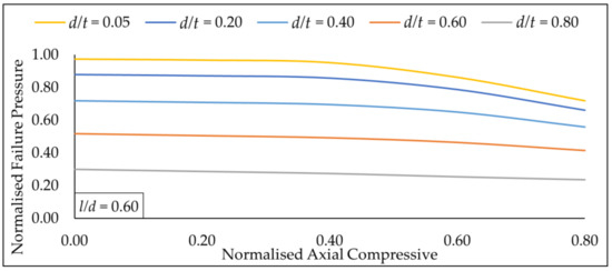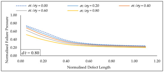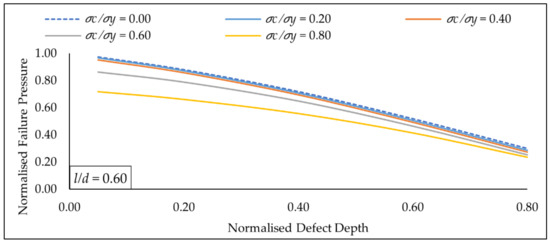 Based on Figure 19, at a constant defect length of 0.60, it was observed that the normalised failure pressure decreases drastically as the normalised defect depth was increased for normalised axial compressive stress values of 0.00 to 0.80. The maximum normalised pressure drop based on normalised axial compressive stress values of 0.00 to 0.80 was observed to be 71.19%. This indicates that the normalised defect depth has a high influence on the normalised failure pressure of a pipe. For shallow depths, the increase in normalised axial compressive stress from 0.00 to 0.80 causes a drastic reduction in the normalised failure pressure. As the normalised defect depth increases, this reduction in failure pressure shrinks by almost half the amount as the normalised defect length approaches 0.80. This pattern was also observed for defect lengths of 0.05, 0.20, 0.40, 0.80, 1.00 and 1.10.
