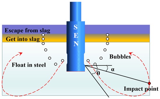 - Lei, H.; Zhu, M.Y.; He, J.C. Mathematical modeling of slag entrapment in continuous casting mould. Acta Metall. Sin. 2000, 36, 1113–1117. [Google Scholar] [CrossRef]