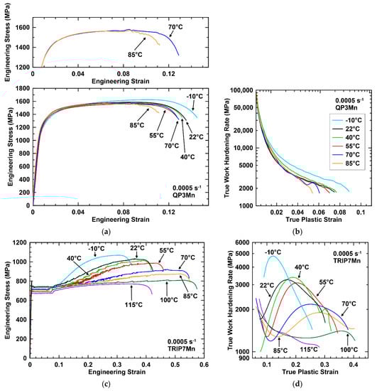 - Increasing temperature causes a substantial decrease in the low strain work hardening rate of medium Mn TRIP, which, combined with decreasing yield strength, contributes to a large increase in UE. In contrast, increasing temperature above room temperature has little or no effect on the work hardening rate of quenched and partitioned steel at most strains. The combination of low temperature sensitivity of YS and work hardening rate leads to the smaller influence of temperature on UE in QP3Mn.