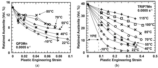 - The strain-induced austenite-to-martensite transformation kinetics are highly temperature sensitive for both medium Mn TRIP and quenched and partitioned steels. The Olson–Cohen model is a good fit to the medium Mn TRIP steel data at all test temperatures, but the Olson–Cohen model does not represent the Q&P steel behavior well at 1% strain for all test temperatures.