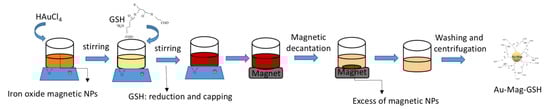 Based on our previous works, we have designed three rapid chemical routes to obtain small GSH-capped gold, magnetic iron oxide, and CdTe QDs [,]. In all these routes, we have promoted a reduction reaction, and we have used GSH to functionalize the NP surface. To synthetize the GSH-capped hybrid gold-iron oxide magnetic NPs, we have developed, in this work, a novel, original method. A diagram of the formation of these GSH-capped NP is shown in the graphical abstract.