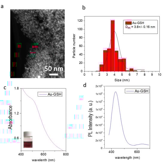 High-angle annular dark field (HAADF) image (a), as well as the histogram displaying particle size distribution (b) of Au-GSH NPs. (c) UV-Visible absorption spectrum and PL emission spectrum (d) of Au-GSH NPs. The inset in Figure 2c shows a digital photo image of an Au-GSH colloidal solution.
