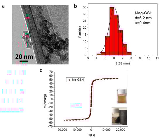 Bright field TEM (BF-TEM) micrograph (a), as well as the histogram displaying the particle size distribution (b) of Mag-GSH NPs. Magnetization curve of Mag-GSH NPs (c). The inset in this figure shows a digital photo image of Mag-GSH NPs placed in the absence and presence of a magnet located close to the vials.