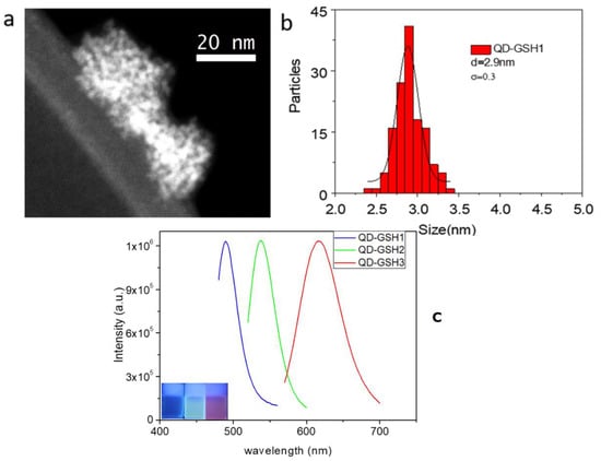 HAADF image (a), as well as the histogram displaying particle size distribution (b) of quantum dot (QD)-GSH1 NPs. (c) PL-emission spectra for QD-GSH1 (blue) as well as for QD-GSH2 (green) and QD-GSH3 (red), with higher average size. The inset in this figure shows a digital photo image of the three QD-GSH colloidal solutions used in this figure, under UV irradiation.