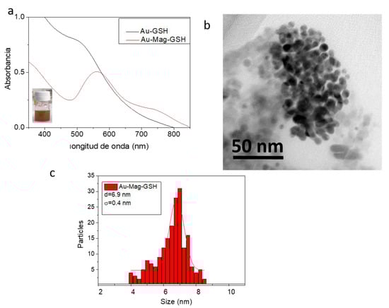 Ultraviolet (UV)–visible spectra for Au-GSH and Au-Mag-GSH colloidal solutions (a); TEM micrograph of Au-Mag-GSH (b) and its corresponding histogram displaying NP size distribution (c).