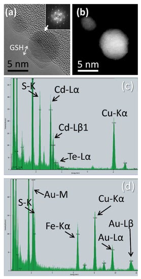High-resolution TEM (HRTEM) (a) and HR-HAADF (b) images of NPs in sample Au-GSH. Punctual energy-dispersive X-ray (EDX) spectrum from QD-GSH (c) and from Au-Mag-GSH (d) NPs.