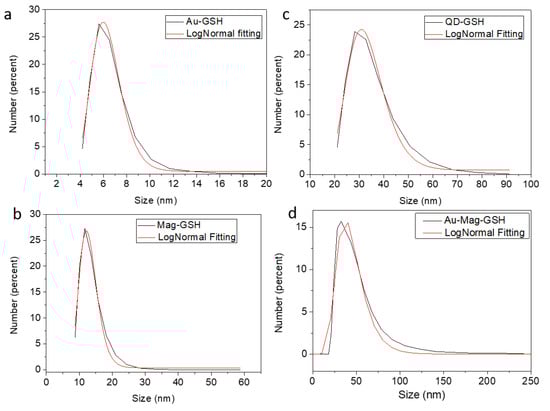 DLS size distributions of Au-GSH (a), Mag-GSH (b), CdTe-GSH1 (c) and Au-Mag-GSH (d) in PBS (phosphate-buffered saline) colloidal solutions.