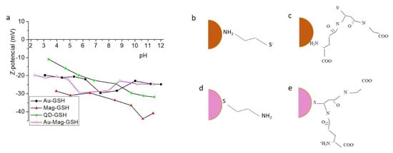 Z-potential versus pH for the different GSH capped NPs (a). Diagram of the cysteamine (CYS)-capped (b) and GSH-capped (c) magnetic-iron-oxide NPs. Diagram of the CYS-capped (d) and GSH-capped (e) gold NPs.