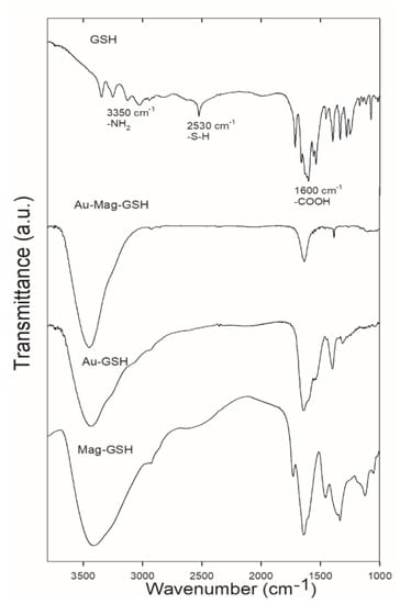 In order to deepen knowledge of the differences in linking mechanisms between gold and iron oxide surfaces, we performed FTIR spectroscopy. Figure 9 shows the FTIR spectra for the free GSH ligand, as well as for Au-GSH, Mag-GSH and Au-Mag-GSH. The GSH spectrum present bands characteristics of amino (3350 cm−1), carboxylic (1600 cm−1) and thiol (2530 cm−1) groups. The peak at 2530 cm−1 that corresponds to the S–H stretching vibration of GSH clearly disappeared in the Au-GSH and Au-Mag-GSH spectra, indicating that GSH anchors on the surface of these NPs through Au-S bonding. Conversely, a band at this position can be appreciated for Mag-GSH. The presence of the S–H stretching vibration band in this case, indicates a different GSH anchorage for this type of NP [].