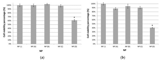 MTT cell viability assay for Jurkat tumor cells incubated with the indicated type of NP at 1.5 μg/mL (a) or 15 μg/mL (b). Percentage of viable cells as compared to cells cultured in the absence of NP (considered as 100% viability) is shown. Mean and standard error are shown for each sample. A representative experiment out of three is shown. Statistically significant differences (p < 0.05) are marked with a star (*).