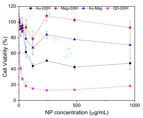 To better ascertaining the toxicity profile, we performed a dose respond experiment with NP concentrations up to 960 μg/mL. As shown in Figure 11, Mag-GSH and Au-Mag-GSH have a very favorable toxicity profile, while QD-GSH are more toxic, with Au-GSH having an intermediate toxicity.