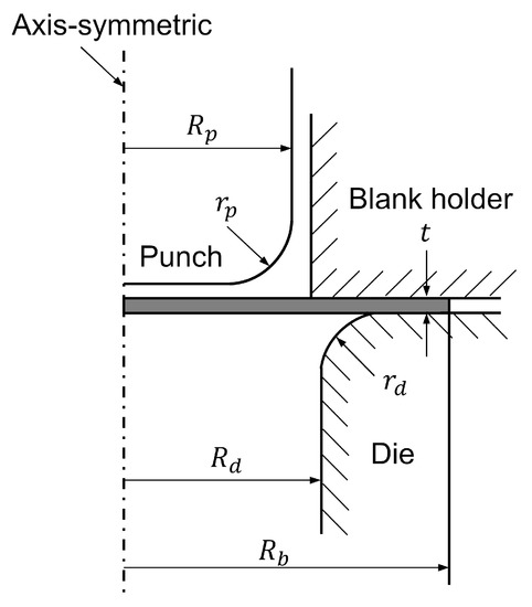 A schematic of the axis-symmetric deep drawing process is shown in Figure 1. Note that Rp and rp are the radius and corner radius of the punch, respectively. Rd and rd are the radius and corner radius of the die, respectively. Rb and t are the radius and thickness of the blank sheet, respectively.