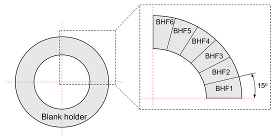 In fact, the BHF provided by the conventional blank holder is primarily applied in a narrow region of the flange edge due to the increase in edge thickness during the deep drawing process [17]. In addition, because of the unsteady plastic-flow phase of the material, the BHF may not be effectively applied to the different flange regions of the sheet metal. This means that the sheet material in distinct flange regions would flow differently into the die cavity caused by the anisotropy of the sheet metal, resulting in the occurrence of earing. In order to overcome these drawbacks, a segmental blank holder was proposed to reasonably apply the varied BHF region by region on the flange of the sheet metal to make the material plastic-flow phase uniform in the die cavity, leading to the reduction of earing formation. For the sake of earing reduction, the greater the number of blank holder segments used, the more control over the earing reduction can be obtained [19]. In the present study, due to the orthogonal symmetry, only a quarter blank holder was generated to divide into six segments for introducing the varying BHF. The blank holder segments were determined and identified by the sensitivity analysis, in which the effect of the number of segments on the reduction of earing or improvement of formability was investigated. For the complex parts, the sensitivity analysis should be carried out to determine the appropriate number of segments. The schematic of the blank holder segment is shown in Figure 2, in which the varying BHF can be applied effectively on different flange regions. For this objective, the quarter blank holder consists of six segments with an accurate angle of 15°. Corresponding to each segment, the applied BHF is needed to properly determine the configuration that results in the greatest reduction of earing formation.