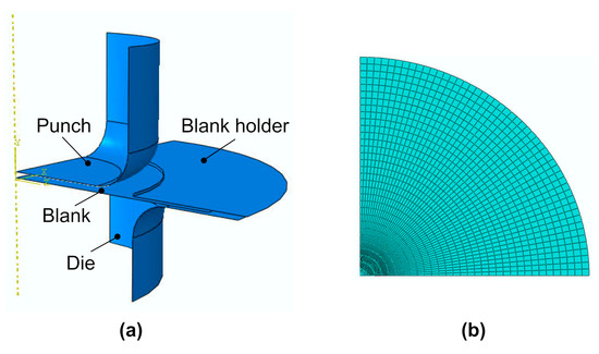 Finite element simulation of the deep drawing process: (a) a quarter finite element (FE) model and (b) FE mesh of blank sheet.