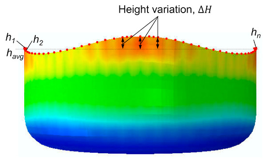 In this work, the earing height variation, ΔH, was used to assess the earing reduction in the deep-drawn cup. Figure 5 shows a schematic of calculating ΔH, estimated as