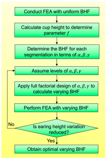 In order to achieve the optimal varying BHF by using the analytical model, a full factorial design is applied to determine the fitting parameter of α, β, and γ, as indicated in Equation (2). In this work, three levels of each factor were assumed as α: 1500, 2900, 4300; β: –650, –250, –450; and γ: 720, 820, 920. The levels of the three factors above were assumed so that 100 ≤ BHF ≤ 5000. The upper and lower limits were chosen to avoid the occurrence of wrinkling or tearing during the deep drawing process. Figure 6 shows the algorithm for the determination of the varying BHF based on the analytical model in conjunction with FE simulation. In the first step, the FE simulation was carried out by using a uniform BHF to obtain the earing formation in the deep-drawn cup. Then, the cup height was found to determine the parameter f using Equation (4). Accordingly, by substituting the [f] into Equation (2), the BHF for each segment was derived in terms of α, β, and γ. With given values of α, β, and γ, the full factorial design was used to generate matrix combinations for calculating the varying BHF. Next, the FE simulations were conducted with different varying BHFs. The criterion used to assess the effect of the varying BHF was the reduction of earing height variation. Finally, the optimal varying BHF, F(θ), was successfully determined in terms of the proper combination of α, β, and γ.