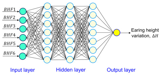 In fact, it is very difficult to establish the functional relationship between the earing height variation output and varying BHF input parameters by conventional mathematical methods. Figure 7 shows the DNN architecture, which is an efficiently predictive model for the prediction of earing height variation in this study. The three-layer DNN model including input, hidden, and output layers was performed by using a feedforward back-propagation neural network in the MATLAB environment. The transfer functions in the hidden and output layers were in the form of hyperbolic tangent sigmoid (tansig) and linear (purelin), respectively. The varying BHF of six segments and the earing height variation were defined as the input and output parameters, respectively. Thus, the number of neurons in the input and output layers were six and one, respectively. Figure 7 shows the DNN model consisting of three hidden layers with seven neurons for each layer. These were determined through the iteration method indicated in Figure 8. The performance of the DNN model was evaluated by mean square error (MSE) and coefficient of determination (R2) as follows: