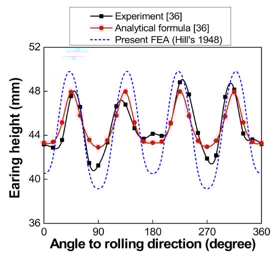 In order to verify the accuracy of the present finite element analysis (FEA), the analytical and experimental results presented by Yoon et al. [36] for aluminum AA2090-T3 sheet material were used. The FE model was generated with the same geometry and material properties as given in Table 1 and Table 2. Additionally, the same blank holding force of 22.2 kN was used in this verification. As shown in Figure 9, the prediction of the earing height profile using the present FEA is represented in comparison with the previous report [36]. Figure 9 shows that the number of predicted ears correlated well with the analytical and experimental findings [36]. The result based on the present FEA showed that the cup height at 0° was higher than the height at 90°, which was in good agreement with the previous experiment. This demonstrates that the present FEA predicted the earing trend correctly and showed good consistency with the earlier works [36]. In addition, the predicted earing could also be confirmed by the theoretical analysis using planar anisotropy, Δr, which is defined as