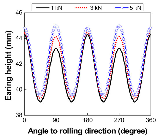 Results of the earing height profiles of AA1050-O using the present finite element analysis (FEA) with uniform BHFs of 1 kN, 3 kN, and 5 kN.