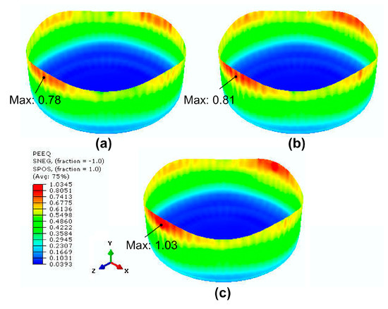 Equivalent plastic strain distribution of the deep-drawn cup of AA1050-O using uniform BHFs of (a) 1 kN, (b) 3 kN, and (c) 5 kN.